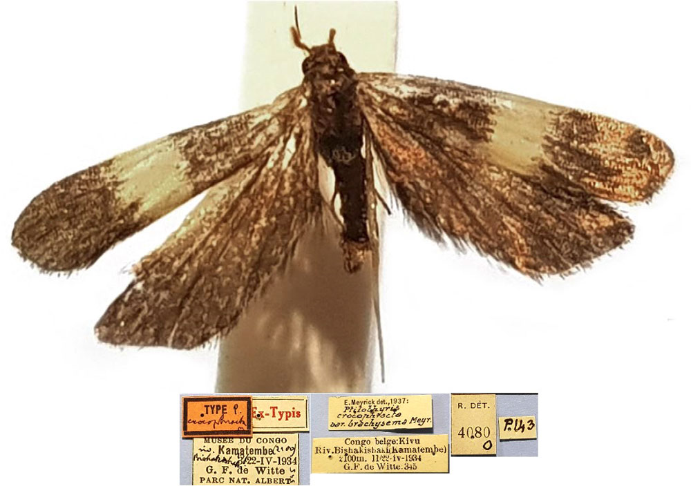 Thubdora crocophracta (Meyrick, 1938) Lectotype RMCA Lectotype ♂, designated by K.-T. Park et al. (2020: 480), genitalia slide K.-T. Park CIS-7217♂, RMCA Congo, the Democratic Republic of the [Democratic Republic of Congo, North Kivu], Belgian Congo, Kamatembe, 2100 m, iv.1934, leg. G. F. de Witte. Park K.-T., Mey W., Koo J.-M., De Prins J., Akite P. & Cho S.-W. 2020. Fourteen new species of the genus Thubdora Park, 2018 (Lepidoptera: Gelechioidea: Lecithoceridae) from Uganda, and three new combinations in Ptilothyris Walsingham, 1897 from DR Congo. page 18; pl. 2, fig. 4