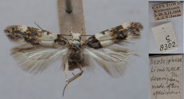 | Neotelphusa limenaea (Meyrick, 1920) | Holotype | ♂ | TMSA | Holotype ♂, TMSA. | South Africa | [South Africa, Western Cape], Cape Colony, Cape Town, xii, leg. R. M. Lightfoot. |