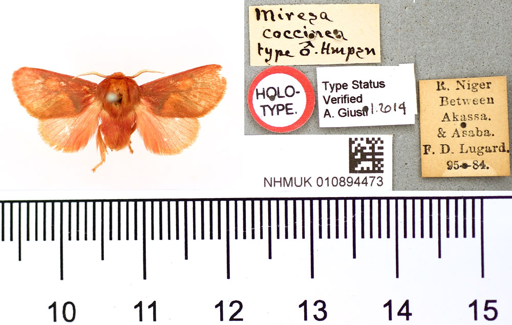 Micraphe coccinea (Hampson, 1910) Holotype NHMUK Holotype ♂, NHMUK. Nigeria Nigeria S, River Niger between Akassa and Asaba, 1895, leg. F. D. Lugard.