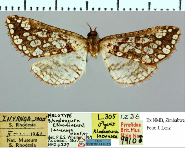 | Rhodoneura lacunosa Whalley, 1971 | Holotype | ♂ | NMB | Holotype ♂, genitalia slide BM 9910♂, NMB | Zimbabwe | [Zimbabwe], S Rhodesia, Inyanga, 7000 ft, ii.1961. | ||