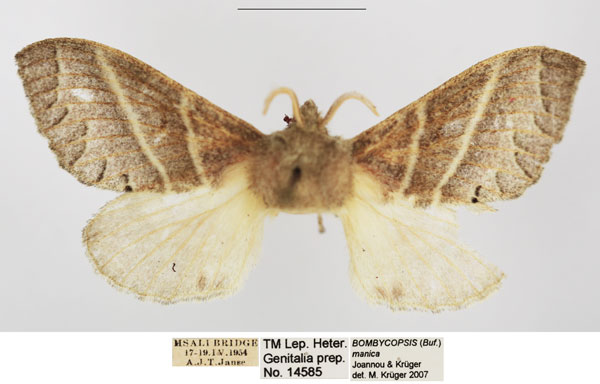 | Bombycopsis manica Joannou & Krüger, 2009 | Holotype | ♂ | TMSA | Holotype ♂, genitalia slide 14575♂, TMSA | Zimbabwe | Zimbabwe, Aberfoyle, Honde Valley, 03–04.xii.1994, leg. N. J. Duke. | ||