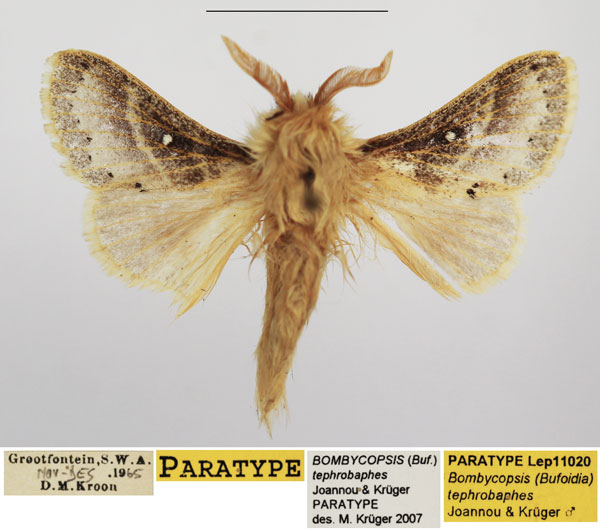 | Bombycopsis tephrobaphes Joannou & Krüger, 2009 | Paratype | ♂ | MfN | Paratypes 146♂, 29♀, genitalia slides 14593♂, 14625♀, 14570♀, 14626♂, 15638♂, 14624♂, 14636♀, 14637♂, 14638♀, 5883♂, 5885♂, 6196♂, 14910♂, 15242♀, 6202♀, 15585♂, 14623♂, 14594♂, TMSA, MfN, MWM. | South Africa | South Africa, Western Cape, Farm Zeekoeivlei near Clanwilliam, 07.vi.2002, leg. Farm staff. |