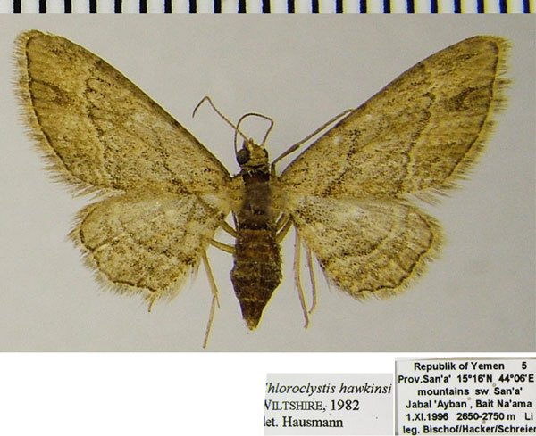 | Chloroclystis hawkinsi Wiltshire, 1982 | Paratype | ♂ | NHMUK | Paratypes 1♂, 3♀, genitalia slides E. P. Wiltshire 96♂, 97♀, NHMB, NHMUK. | Yemen | Yemen S, W Aden Protectorate, Jebel Jihaf, 7100 ft, x.1937, leg. H. Scott & E. B. Britton. |