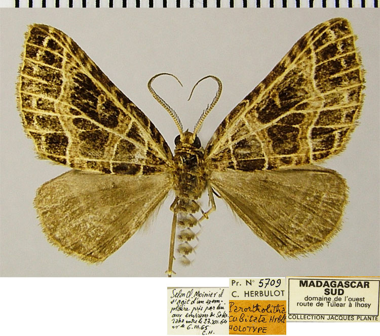 | Parortholitha cubitata Herbulot, 1981 | Holotype | ♂ | ZSM | Holotype ♂, genitalia slide C. Herbulot 5709♂, ZSM. | Madagascar | Madagascar W, Road from Tulear [Toliara] to Ihosy, near Sakahara, 23.xii.1964–06.iii.1965, leg. C. Moinier. |