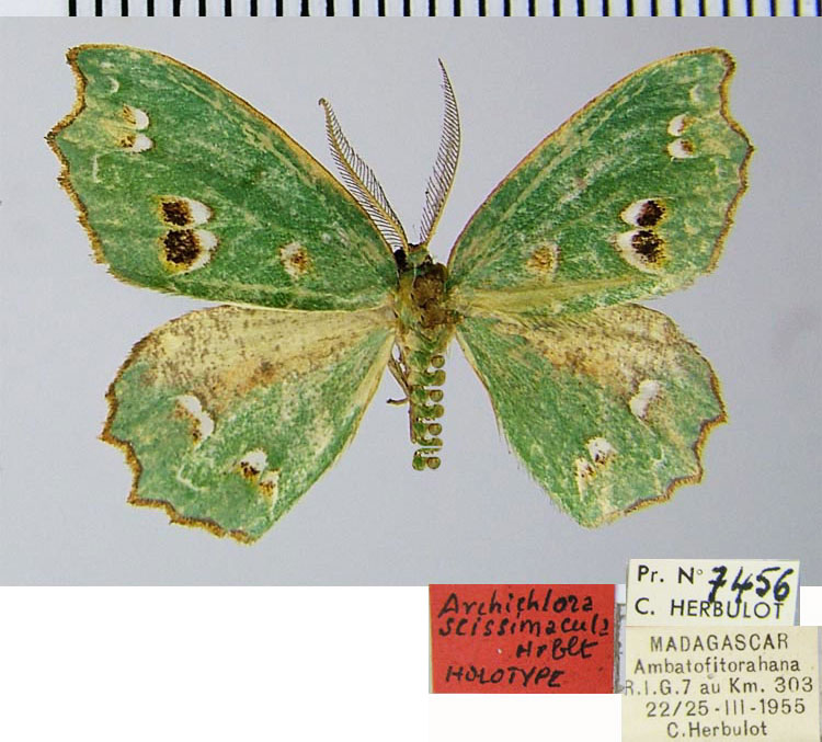 Archichlora scissimacula Herbulot, 2000 Holotype ZSM Holotype ♂, genitalia slide C. Herbulot 7456♂, ZSM. Madagascar Madagascar, Ambatofitorahana, R.I.G. 7 at km 303, 22–25.iii.1955, leg. C. Herbulot.