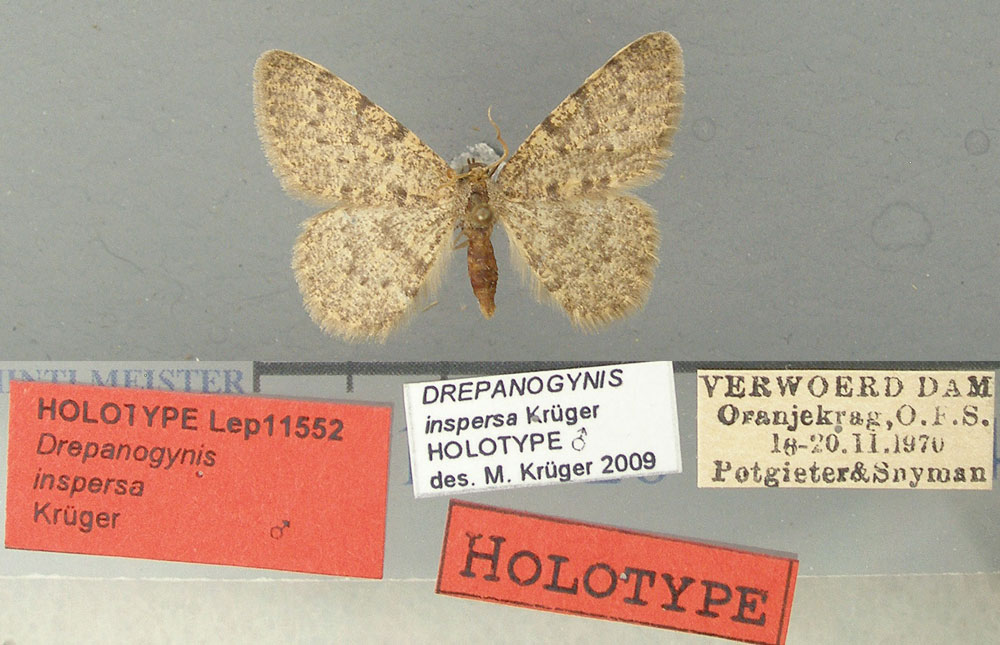 | Drepanogynis inspersa Krüger, 2009 | Paratype | ♂ | TMSA | Paratypes 17♂, genitalia slide 15203♂, TMSA, coll. Staude. | South Africa | South Africa, Free State, Verwoerd Dam, Oranjekrag, 18–20.ii.1970, leg. Potgieter & Snyman. |