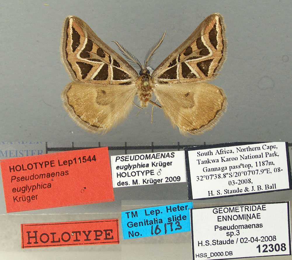 | Pseudomaenas euglyphica Krüger, 2009 | Holotype | ♂ | TMSA | Holotype ♂, genitalia slide 16173♂, TMSA | South Africa | South Africa, Northern Cape, Tankwa Karoo National Park, Gannaga Pass Top, 1187 m, 08.iii.2008, leg. H. S. Staude & J. B. Ball. | ||