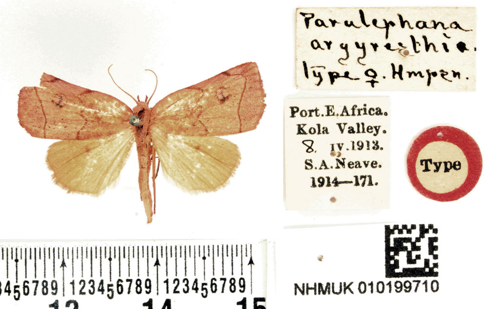| Paralephana argyresthia Hampson, 1926 | Holotype | ♀ | NHMUK | Holotype ♀, NHMUK. | Mozambique | [Mozambique], Portuguese E Africa, Kola Valley, 08.iv.1913, leg. S. A. Neave. |