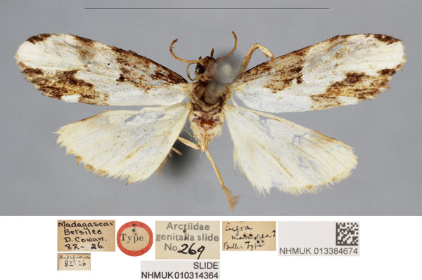 | Exilisia marmorea (Butler, 1882) | Holotype | ♂ | NHMUK | Holotype ♂, genitalia slide Arctiidae 269♂, NHMUK. | Madagascar | Madagascar, Betsileo Country, Ankafana [Ankafina Forest], leg. W. D. Cowan. |
