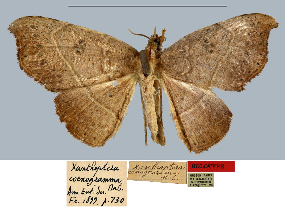 | Cautatha coenogramma (Mabille, 1900) | Holotype | ♀ | MNHN | Holotype ♀, MNHN (see P. Viette 1954c: 386, P. Viette & D. S. Fletcher 1968: 416). | Madagascar | Madagascar, Antongil Bay, 1898, leg. A. Mocquerys. | Viette P. 1954c. Les types des Lépidoptères Hétérocères malgaches de Mabille se trouvant au Muséum National, Paris. page 730 |