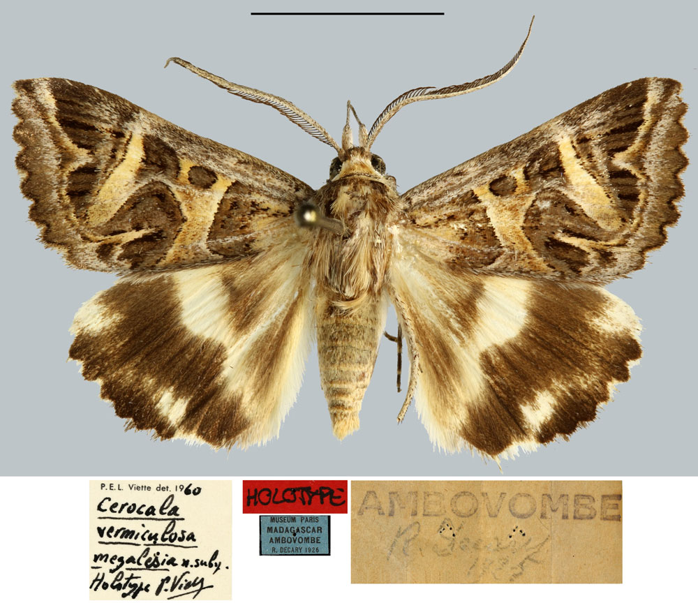 | Cerocala megalesia Griveaud & Viette, 1962 | Holotype | ♂ | MNHN | Holotype ♂, MNHN | Madagascar | Madagascar S, Ambovombe, 1925, leg. R. Decary. | ||