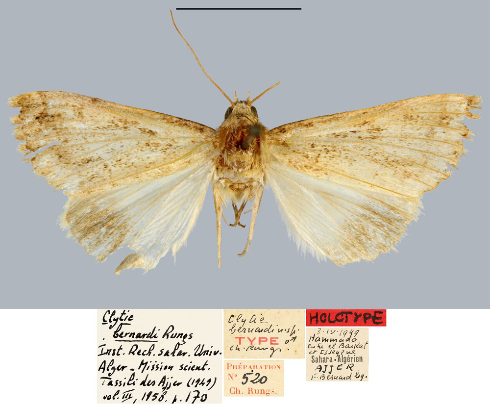 | Clytie bernardi Rungs, 1958 | Holotype | ♂ | MNHN | Holotype ♂, MNHN | Algeria | Algeria, Tassili des Ajjer, El Barkat, Hammada e Isseyen, 03.iv.1949, leg. F. Bernard. | ||