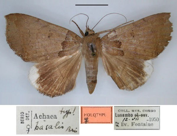 | Achaea basalis Berio, 1954 | Holotype | ♀ | RMCA | Holotype ♀, RMCA | Congo, the Democratic Republic of the | [Democratic Republic of Congo, East Kasai], Lusambo, 12.vii.1950, leg. M. Fontaine. | ||