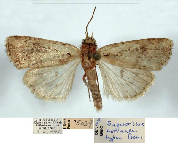 Axylia extranea (Berio, 1972) Holotype MSNM Holotype ♂, genitalia slide E. Berio 5029♂, MSNM. Tanzania Tanzania, District Njombe, Kipengere Range, Ikonda, 2050 m, 03.iv.1971, leg. Dall'Olmo.