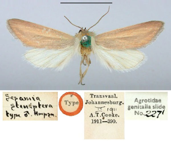 | Sesamia steniptera Hampson, 1914 | Holotype | ♂ | NHMUK | Holotype ♂, genitalia slide 2271♂, NHMUK. | South Africa | [South Africa, Gauteng], Transvaal, Johannesburg, iv.1911, leg. A. T. Cooke. |