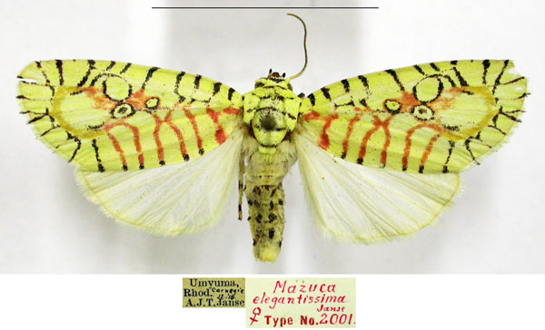 | Mazuca elegantissima Janse, 1939 | Paratype | ♀ | TMSA | Paratype 1♀, TMSA. | Zimbabwe | Zimbabwe, Rhodesia, Umvuma, xii.1918, leg. A. A. Carnegie. |