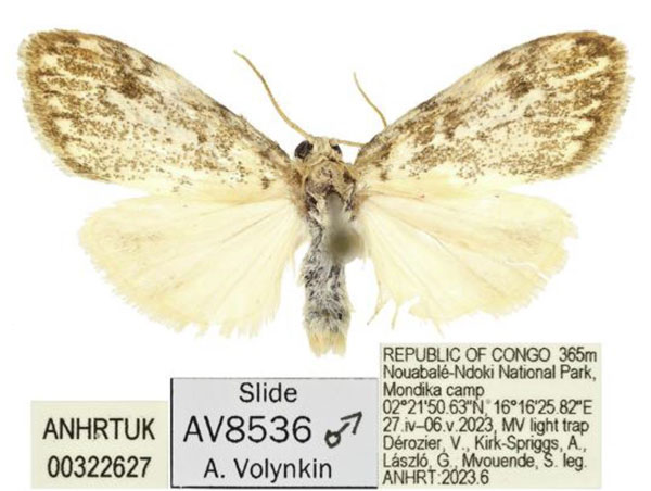 Palaeugoa laszloi Volynkin, 2024 Paratype ANHRT Paratypes 3♂, genitalia slide A. V. Volynkin 8535♂, ANHRT. Congo Congo, Nouabalé-Ndoki National Park, Mondika camp, 02°21'50.63''N 16°16'25.82''E, 365 m, 27.iv–06.v.2023, leg. V. Dérozier, A. Kirk-Spriggs, G. M. László & S. Mvouende.