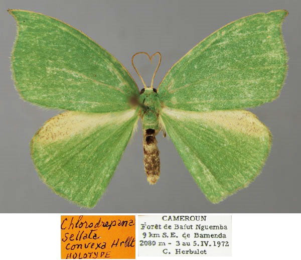 Chlorodrepana sellata convexa Herbulot, 1986 Holotype ZSM Holotype ♂, ZSM Cameroon Cameroon, Bafut Nguemba Forest, 9 km SE of Bamenda, 2080 m, 03–05.iv.1972, leg. C. Herbulot.