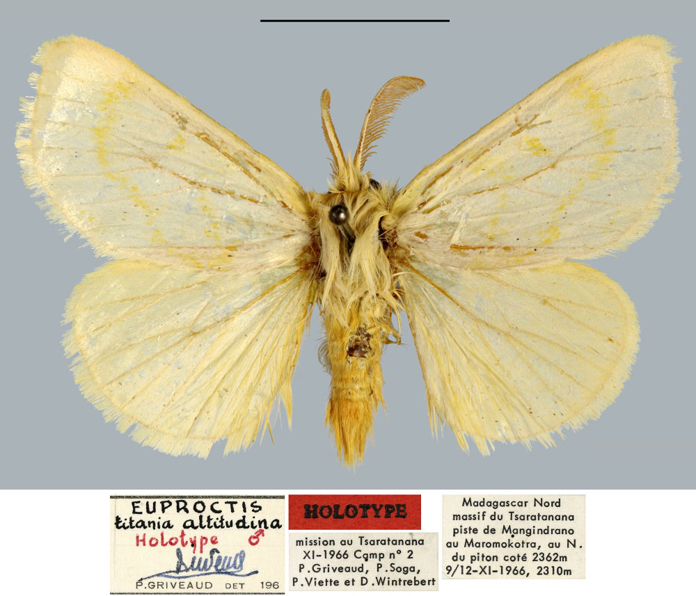 Euproctis straminicolor altitudina Griveaud, 1970 Holotype MNHN Holotype ♂, MNHN Madagascar Madagascar N, Tsaratanana Massif, track from Mangindrano to Maromokotra, au nord du piton coté, 2362 m, 09–12.xi.1966, leg. P. Griveaud & P. Viette.
