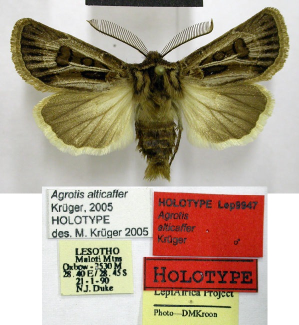 | Agrotis alticaffer Krüger, 2005 | Holotype | ♂ | TMSA | Holotype ♂, type no 9947, TMSA | Lesotho | Lesotho, Maloti [Maluti] Mts, Oxbow, 2530 m, 21.i.1992, leg. N. J. Duke. | ||