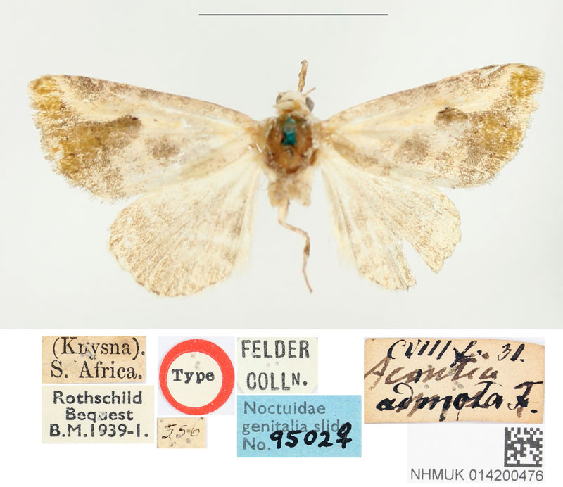| Eublemma admota (Felder R. & Rogenhofer, 1875) | Holotype | ♀ | NHMUK | Holotype ♀, genitalia slide Noctuidae 9502♀, NHMUK. | South Africa | South Africa, Western Cape, Africa meridionalis, Knysna, leg. R. Trimen. |