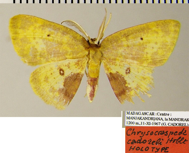 | Chrysocraspeda cadorelae Herbulot, 2000 | Holotype | ♂ | ZSM | Holotype ♂, ZSM. | Madagascar | Madagascar, Manjakandriana, La Mandraka, 1200 m, 11.xi.1967, leg. G. Cadorel. |