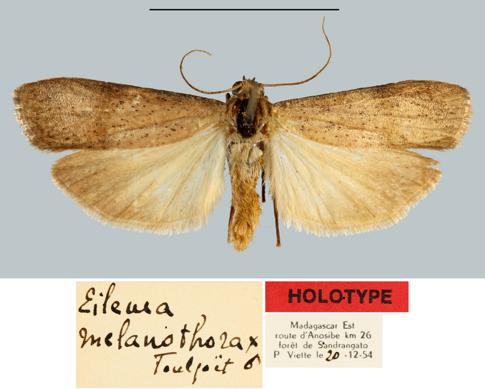 | Eilema melanothorax Toulgoët, 1957 | Holotype | ♂ | MNHN | Holotype ♂, MNHN | Madagascar | Madagascar E, road to Anosibe at km 26, Sandrangato Forest, 20.xii.1954, leg. P. Viette. | ||