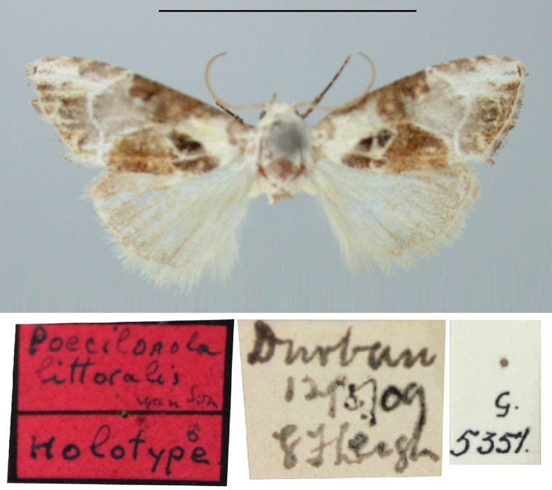| Vansonima littoralis (van Son, 1933) | Holotype | ♂ | TMSA | Holotype ♂, genitalia slide 5357♂, TMSA | South Africa | [South Africa, KwaZulu-Natal], Natal, Durban, 12.iii.1909, leg. G. F. Leigh. | ||