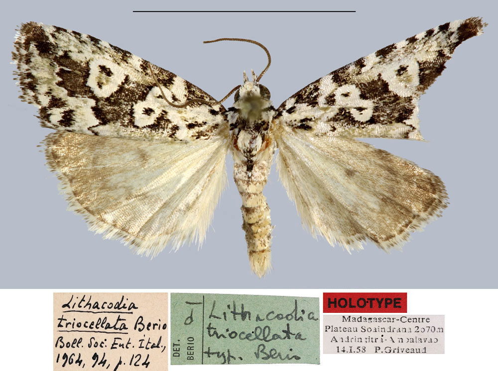 | Deltote triocellata (Berio, 1964) | Paratype | ♂ | MSNM | Paratypes 1♂, 1♀, MSNM. | Madagascar | Madagascar Central, Plateau Soaindrana, Andringitra, Ambalavao, 2070 m, 14.i.1958, leg. P. Griveaud. |