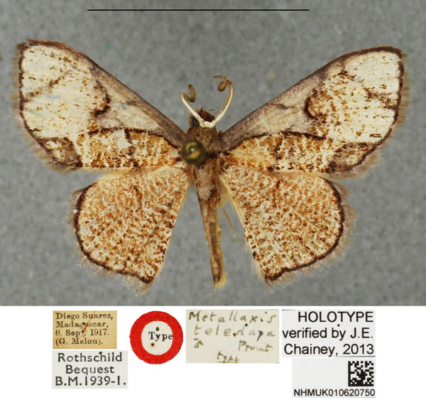 | Metallaxis teledapa Prout L. B., 1932 | Syntype | ♂ | NHMUK | Syntypes 12♂, NHMUK. | Madagascar | Madagascar, Diego Suarez [Antsiranana], 06.xi.1917, leg. G. Melou. |