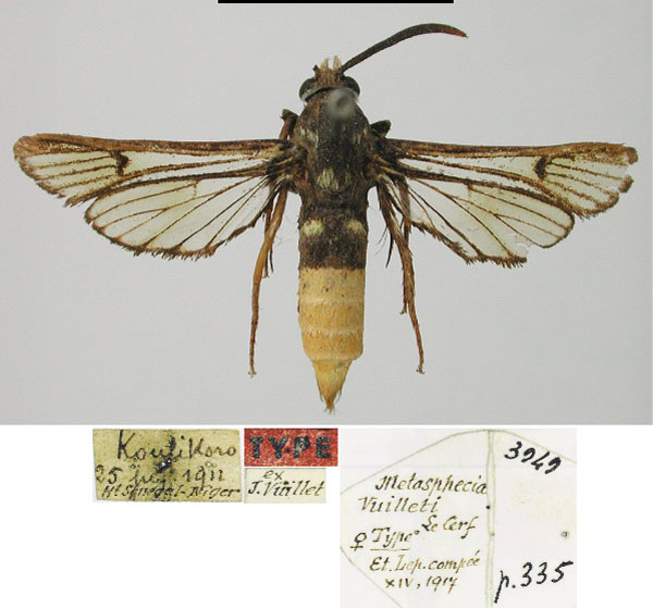 | Metasphecia vuilleti Le Cerf, 1917 | Holotype | ♀ | MNHN | Holotype ♀, MNHN (see Y. Arita et al. 2021: 34). | Senegal | Mali, Haut-Sénégal et Niger, Koulikoro, 05.vi.1912, leg. Vuillet. | Arita Y., Gorbunov O. G., Kallies A. & Yata N. 2021. Historical type specimens of Sesiidae species kept in European museums. page 335–337; pl. 479, fig. 3949 |