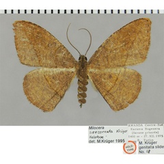 | Milocera sexcornuta Krüger, 2001 | Cameroon | Krüger M. 2000a. The genus Eupithecia Curtis in Lesotho (Lepidoptera, Geometridae: Larentiinae). page 47 | ||