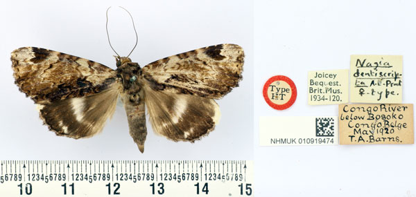 | Catephia dentiscripta (Prout A. E., 1921) | Holotype | ♀ | NHMUK | Holotype ♀, NHMUK. | Congo, the Democratic Republic of the | Democratic Republic of Congo, Orientale, Central Africa, Congo belge, Congo River below Bosoko, v.1920, leg. T. A. Barns. |