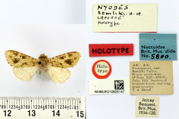 | Nyodes semliki Laporte, 1971 | Holotype | ♂ | NHMUK | Holotype ♂, genitalia slide B. Laporte 511♂ [= Noctuidae 5800♂], NHMUK. | Congo, the Democratic Republic of the | [Democratic Republic of Congo, Province Orientale], W Semliki Valley, Escarpment, 20 miles SW of Boga, 3500–4000 ft, vii.1924, leg. T. A. Barns. |