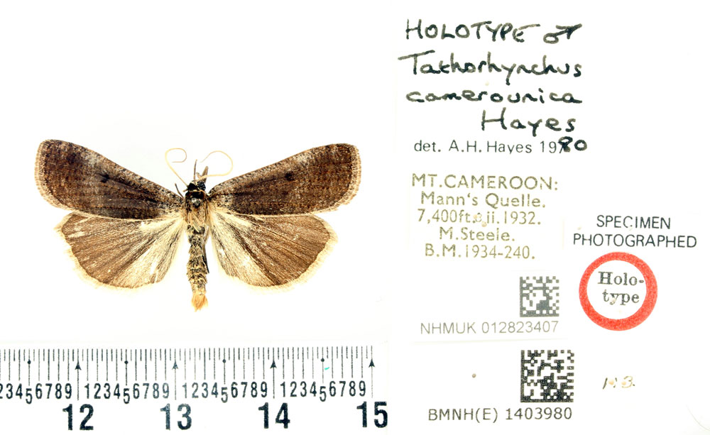 | Tathorhynchus camerounica Hayes, 1980 | Paratype | ♂ | NHMUK | 36 Paratypes ♂, ♀, NHMUK. | Cameroon | Cameroon, Mt Cameroon, Mann's Quelle, 7400 ft, 03.ii.1932, leg. M. Steele. |
