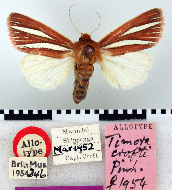| Timora crofti Pinhey, 1956 | Paratype | ♂ | NHMUK | Paratypes ♂, ♀ (number not stated), genitalia slide Noctuidae 8099♀, NHMUK, Coryndon Museum, Nairobi. | Tanzania | [Tanzania], Tanganyika, Shinyanga, Mwandui, iii.1952, leg. Croft. |